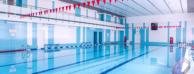 Бассейн спортивного комплекса Академии управления имеет 4 плавательные дорожки, его длина – 25 м, ширина – 12 м, глубокая часть – 200 см, мелкая часть – 140 см.