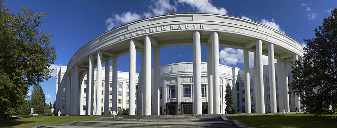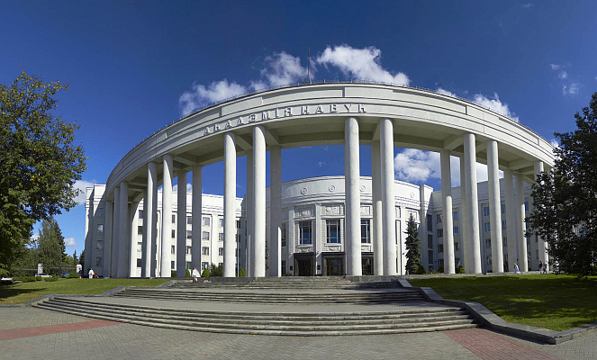 Академия наук БССР была образована в 1928 году, после чего был создан архитектурный проект и затем началось и строительство. Как нередко бывает, в процессе сооружения первоначальный план был пересмотрен, родилась оригинальная 2-х рядная колоннада, соединившая воедино уже построенные части комплекса. В результате было построено незаурядное здание в стиле конструктивизма. Во время ВОВ здание сильно пострадало, но вскоре было восстановлено заново.