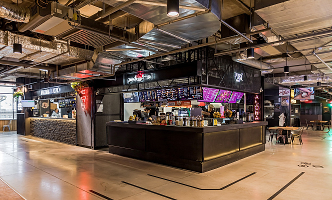 Фудмолл объединяет более 20 корнеров с оригинальными гастроконцепциями и кухнями разных стран мира, более 10 маркетов и лавок с различными товарами и продуктами, фирменный бар, сцену для мероприятий с огромным экраном и многое другое.