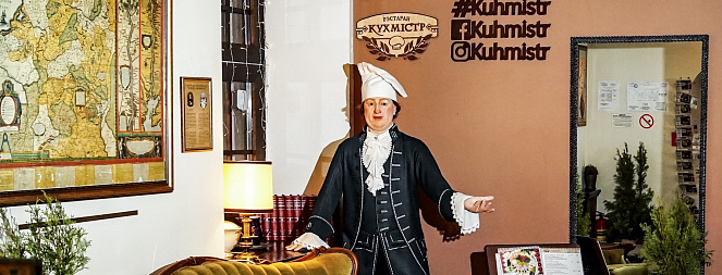 У входа в ресторан гостей встречает самый настоящий Кухмистр! Одетый по моде рубежа XVIII-XIX вв., собирательный образ всех славных шеф-поваров нашей истории, но более всего взявший у знаменитого Павла Тремо –кухмистра последнего короля Речи Посполитой Станислава Понятовского.