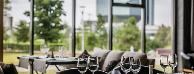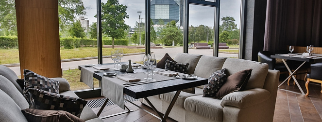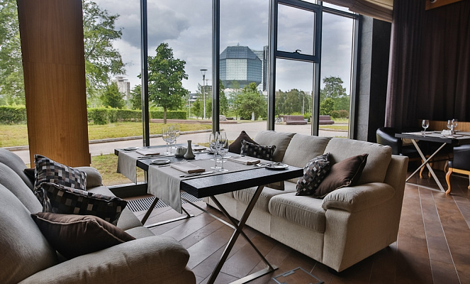 Интерьер помещений – фьюжн с американским акцентом. Вся отделка выполнена из натурального дерева и камня. Наполненное воздухом пространство, панорамные окна и вид на Национальную библиотеку помогут вам по-настоящему окунуться в расслабляющую атмосферу и получить удовольствие.