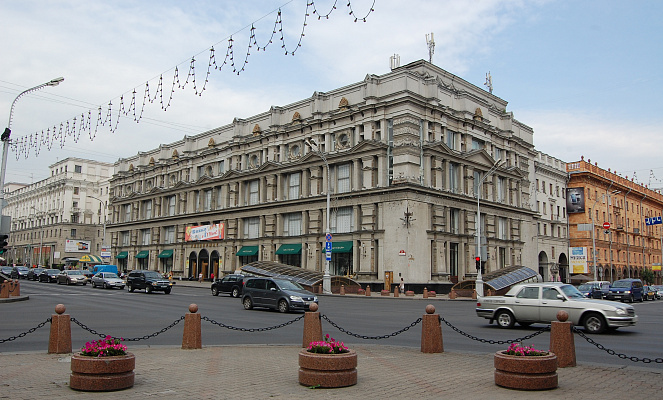 Решение о строительстве нового универсального магазина было принято 26 июля 1945 года в Кремле зампредом Совнаркома СССР Анастасом Микояном. Универмаг стал первым объектом вновь создаваемого архитектурного центра г. Минска. Ведущим автором проекта явился архитектор Роман Михайлович Гегарт.