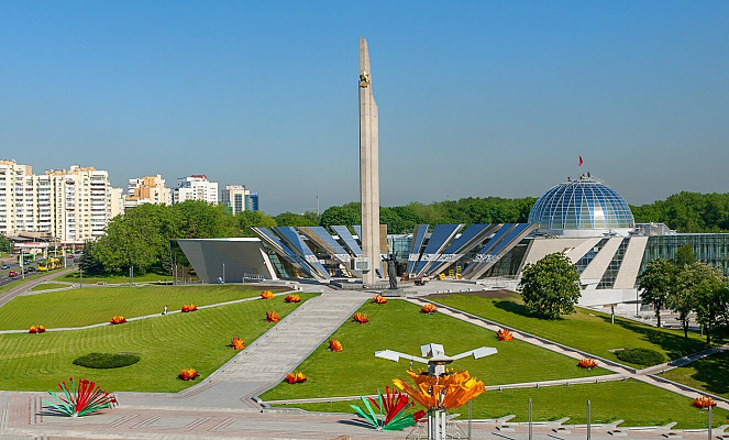 Архитектурный комплекс «Минск — город-герой» включает в себя высокий бетонный обелиск и бронзовую скульптуру «Родина-мать». Обелиск установлен на возвышенности в начале парка Победы, перед зданием Белорусского государственного музея истории Великой Отечественной войны. Нестандартные пространственно-архитектурные приемы и образные решения создают у посетителя ощущение величайшей трагедии и, одновременно, погружают в атмосферу мужества и подвига.