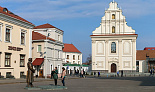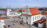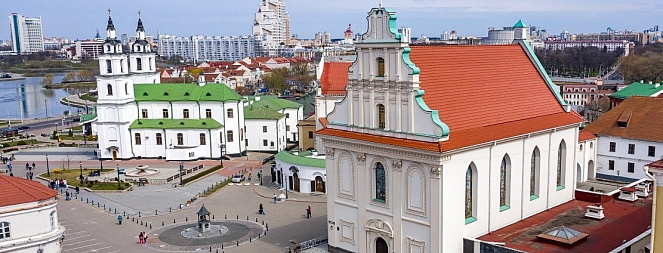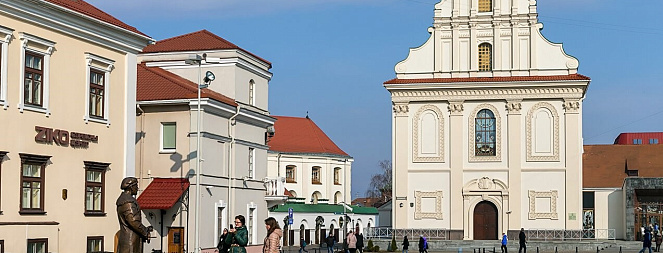 В ХVII–ХVIII вв. это был главный храм греко-католического (униатского) монастыря ордена базилиан. Богатый пластикой фасад церкви, возведенной в 1616 (по другим данным в 1636) году и вобравшей в себя элементы готики, ренессанса и барокко, прежде украшала уникальная монументально-декоративная фресковая живопись на темы жития святых – своеобразный иконостас, вынесенный наружу. Такой прием практически не встречался в культовой архитектуре Европы и был особенностью белорусского зодчества. В 1795 году новые российские власти закрыли униатский монастырь, а церковь Святого Духа передали под кафедральный православный Петропавловский собор. После нескольких перестроек ХIХ века храм приобрел псевдорусские формы. В 1923 году здесь состоялся Собор духовенства, провозгласивший Белорусскую автокефальную православную церковь. Но вслед за Московским патриархатом свое недовольство церковной автономией выразило советское коммунистическое руководство, и вскоре церковные деятели, выступавшие за независимость белорусской церкви, были арестованы.