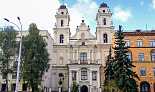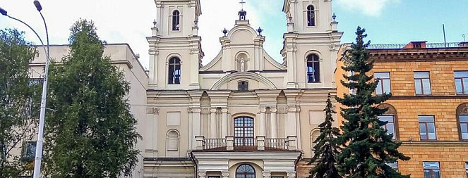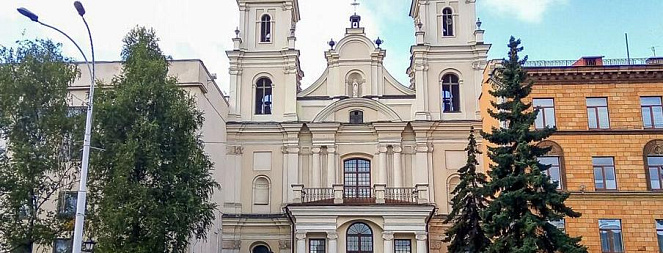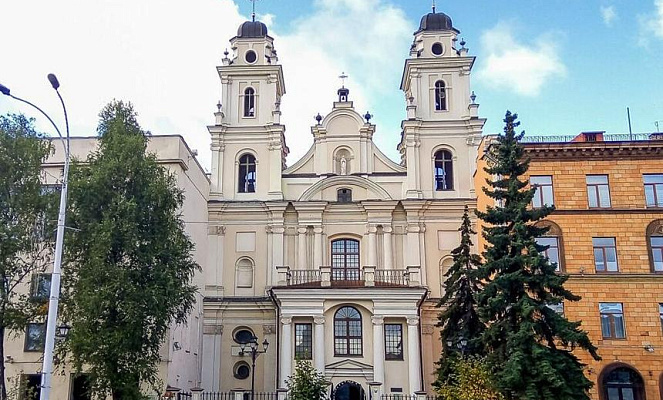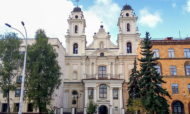 История общества Иисуса в Минске начинается в середине XVII века, когда в город прибыли первые члены общества. В 1683 году было начато строительство монастыря, а 24 октября 1700 года был заложен каменный монастырский храм. Благодаря многочисленным пожертвованиям строительство шло быстро, в 1708 году был закончен интерьер, а 16 марта 1710 года виленский епископ Константин Казимир Бжостовский освятил иезуитский костёл во имя Иисуса, Марии и св. Барбары