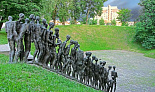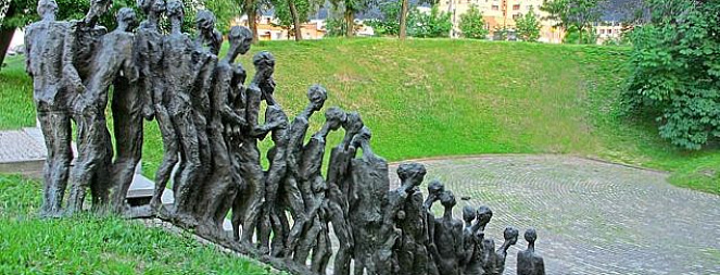 Авторы мемориала в его современном исполнении - Л. Левин, А. Финский, Э. Поллак. Датируется он 2000 годом. Впечатляющей является уже сама идея, воплощенная архитектурными и скульптурными средствами. Спуск в яму - 17 ступенек, по ним идут люди (27 фигур, художественно решенных в абстрактном обобщающем стиле): отлитые из металла, символические фигуры, собирательные образы. Люди идут на смерть, осознавая это. Поверхность металла оставлена шершавой, изъязвленной трещинами, и это воспринимается трагически и гармонично: впереди смерть, искажающая черты, фигуры, лица. И не спасает ни небо, сколько бы ни обращаться к нему в немом зове (первая, ведущая фигура), ни талант (замыкающая фигура со скрипкой - одновременное воплощение миролюбивого национального духа).