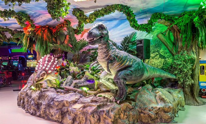 Входя в страну ДинозавриЯ, вы попадете в доисторический мир джунглей и динозавров, а спускаясь по винтовой лестнице на нижний ярус — окунетесь в подводный мир. Декорации в помещениях будут имитировать то джунгли, то морское дно с коралловыми рифами.